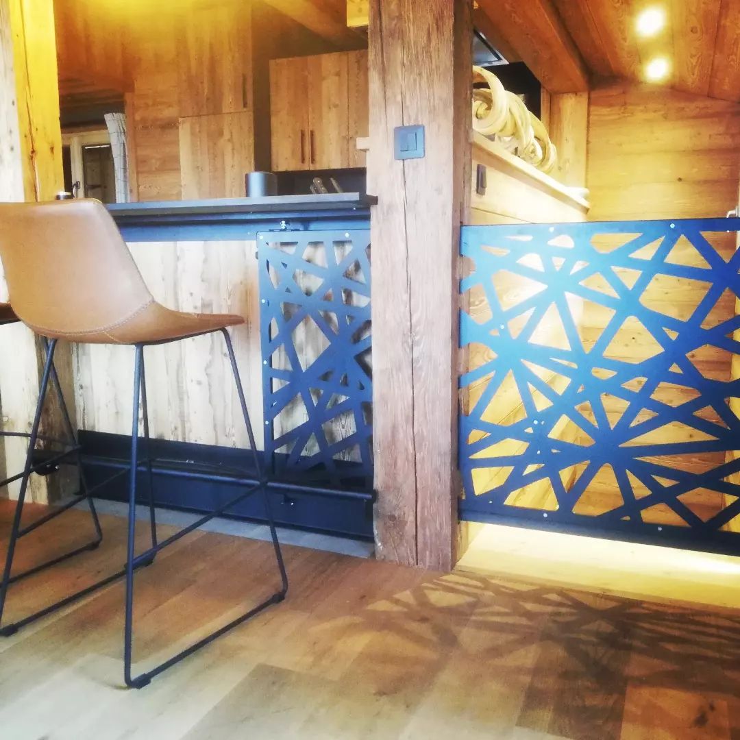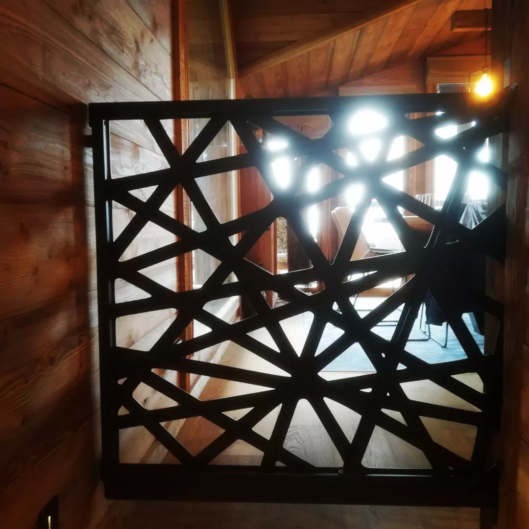 Agencement intérieur d’un portillon coulissant, découpe laser, pour bar intérieur chalet, protéger l’accès aux escaliers tout en parant l’intérieur du chalet d’un motif ajouré découpé au laser